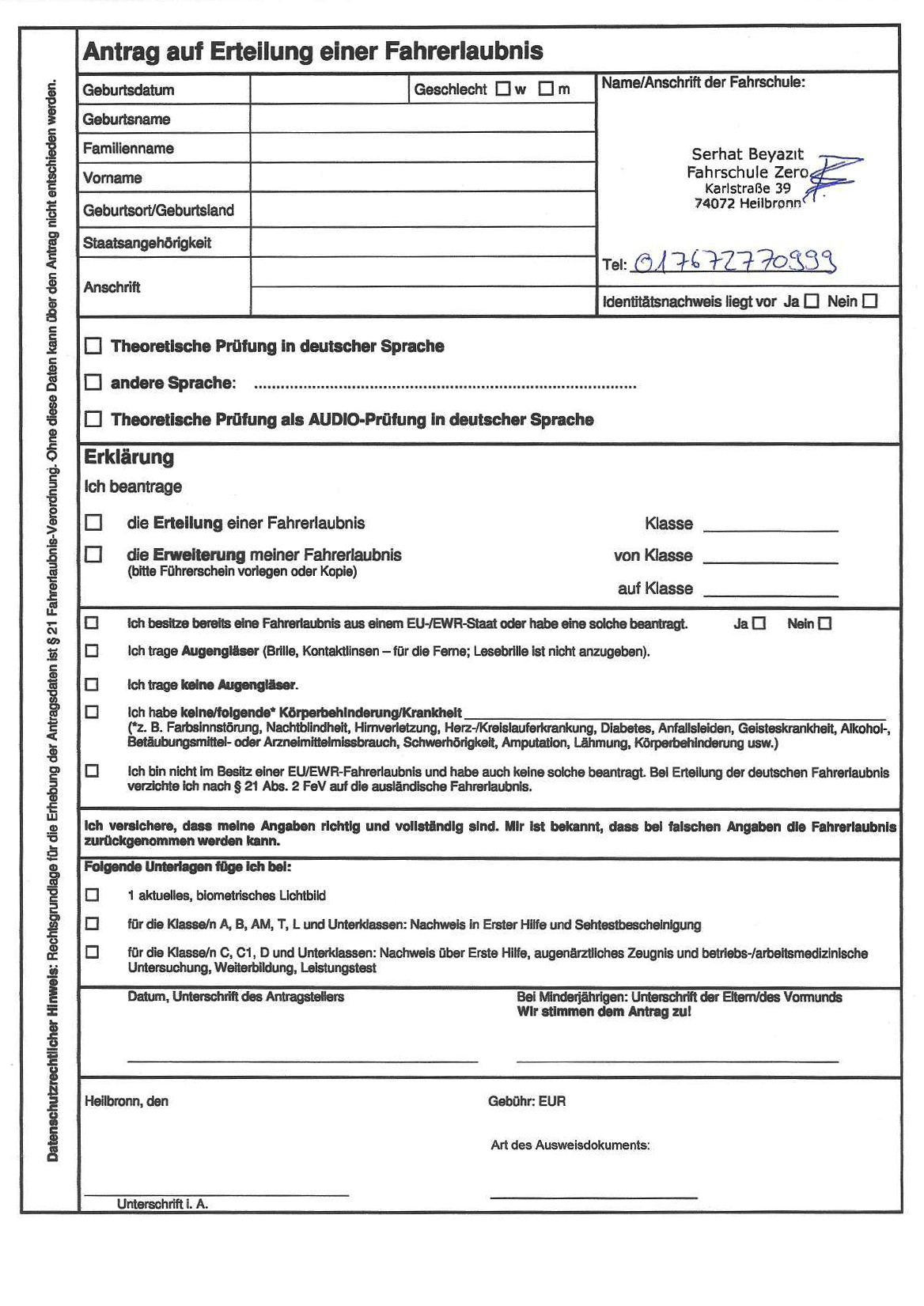 Den Führerscheinantrag erhältst bei uns in der Fahrschule. Dazu kommst du einfach zu unseren Bürozeiten zu uns in die Fahrschule.